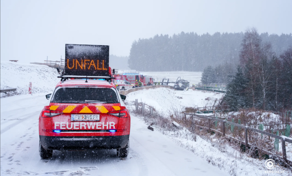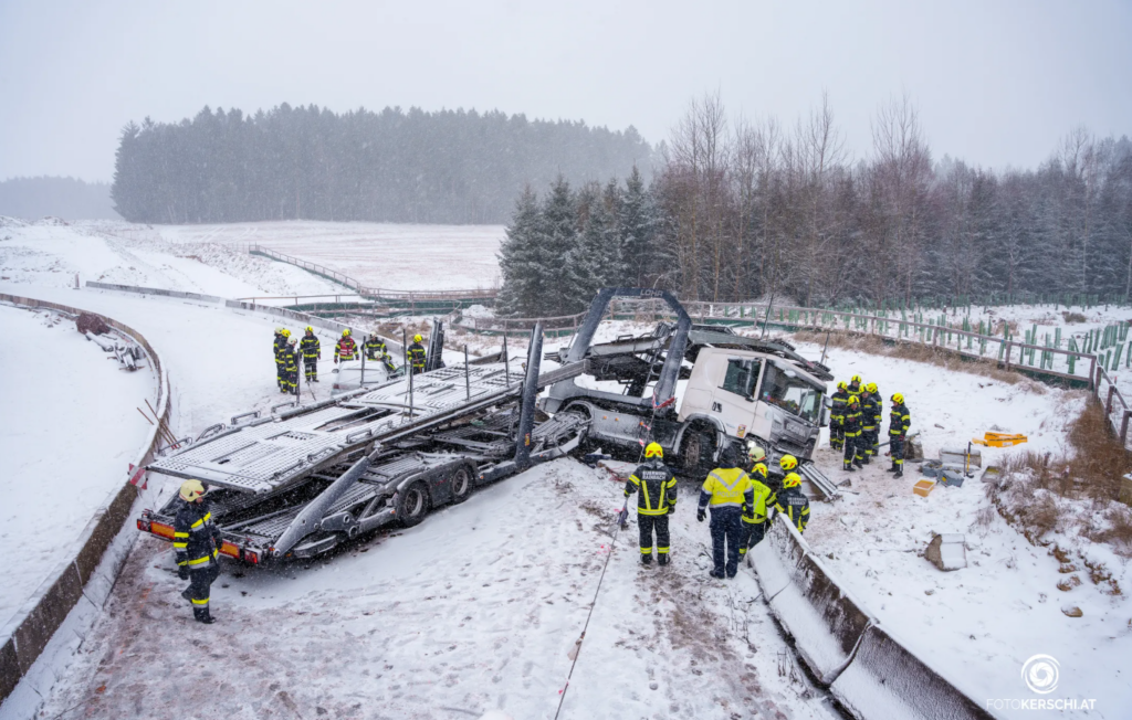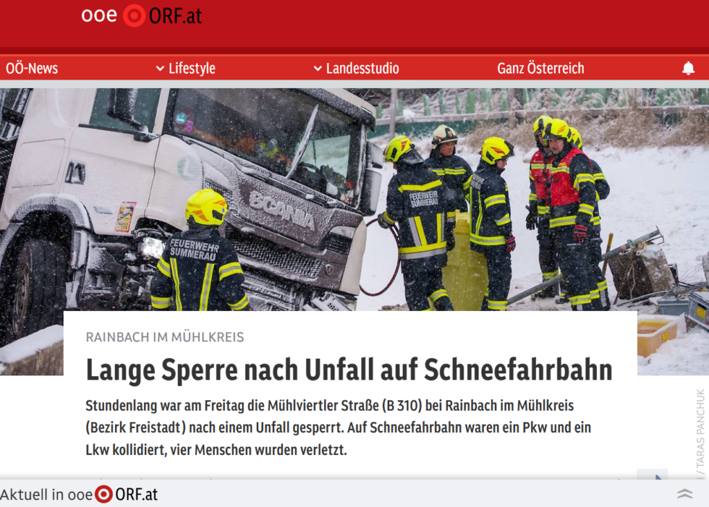 Bericht und Fotos ORF OÖ Lange Sperre nach Unfall auf Schneefahrbahn – ooe.ORF.at