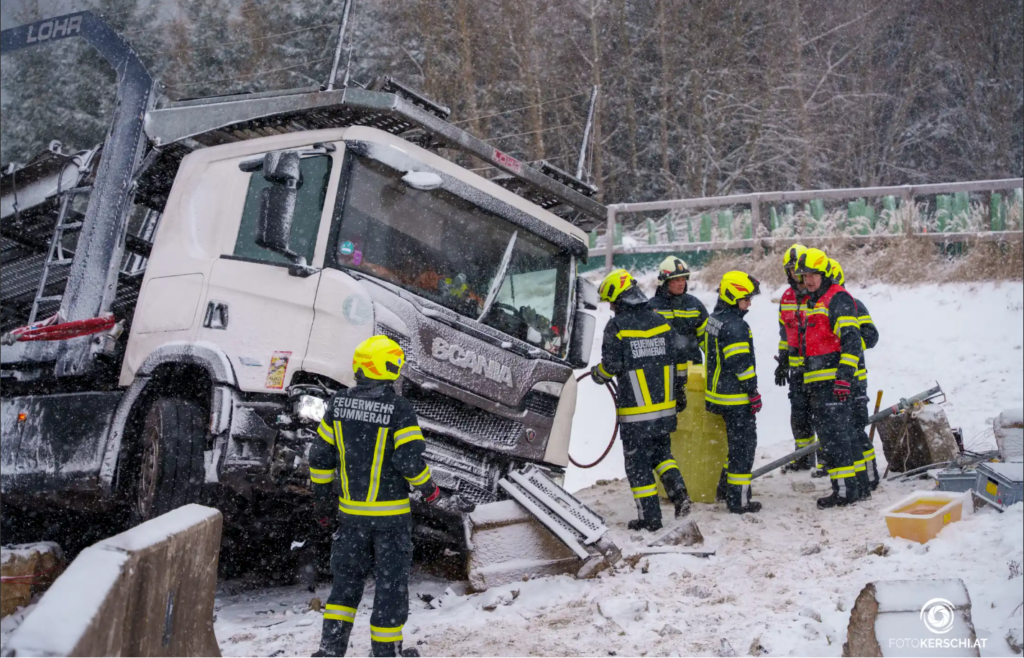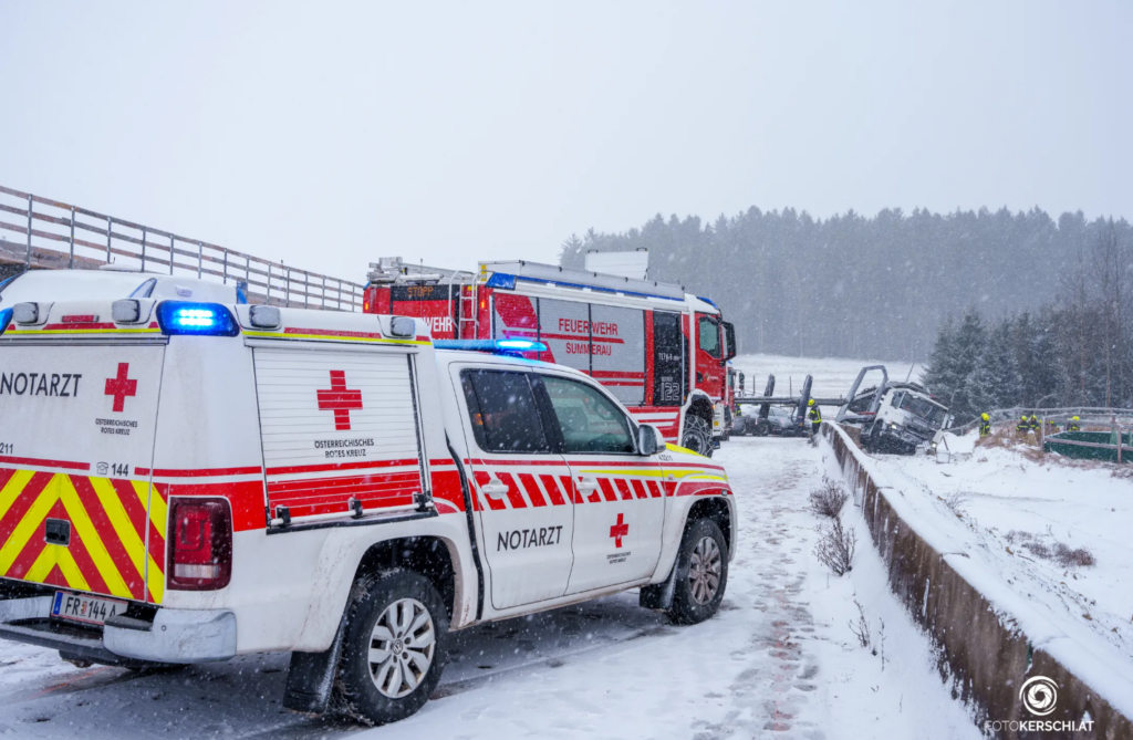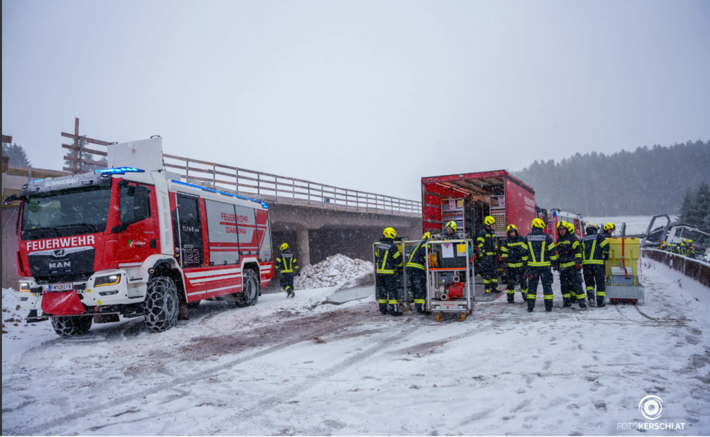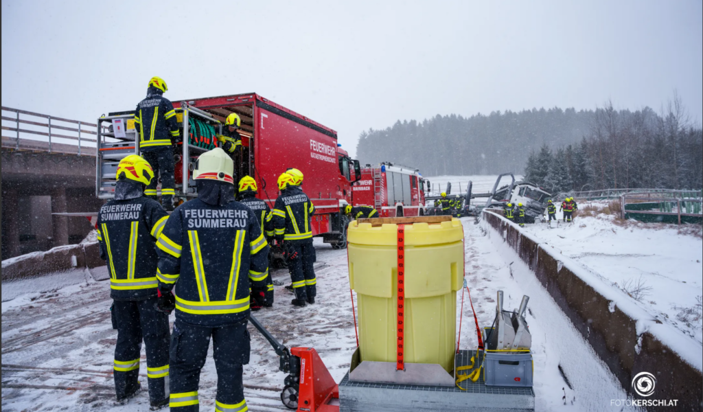 Zwischen Rainbach und Kerschbaum kollidierten am Freitag, 02.01.2026 ein LKW und ein PKW auf einer Schneefahrbahn. Laut ORF OÖ/Polizei wurden zwei Personen schwer verletzt. Neben der FF Rainbach war auch die FF Summerau mit TLFA-B, LAST-KS und MTF mit 18 Mann ausgerückt. Nach dem Befreien der verunfallten Personen galt es für die FF Summerau austretende Flüssigkeiten zu binden. Seitens der BH Freistadt und Land OÖ waren Behördenvertreter vor Ort, um die bevorstehenden Maßnahmen zu besprechen. Auch Notarzt, Rotes Kreuz und Polizei standen im Einsatz. Die FF Summerau war von 10:00 bis 16:45 Uhr im Einsatz.